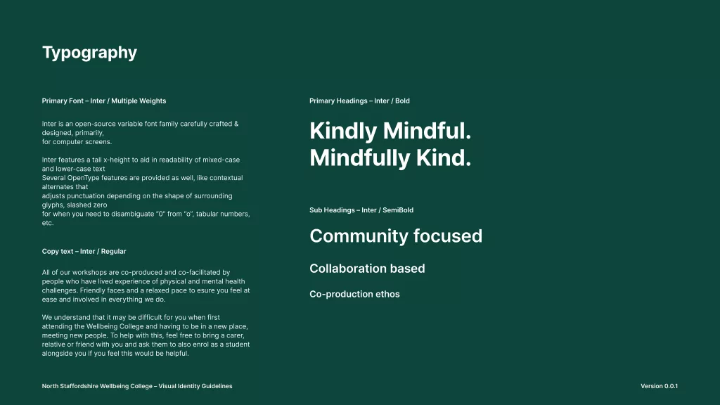With accessibility being a legal requirement, I proposed using larger typesetting and a highly versatile open source font with a tall x-height to aid in readability of mixed-case and lower-case text, landing on the open source family – INTER.